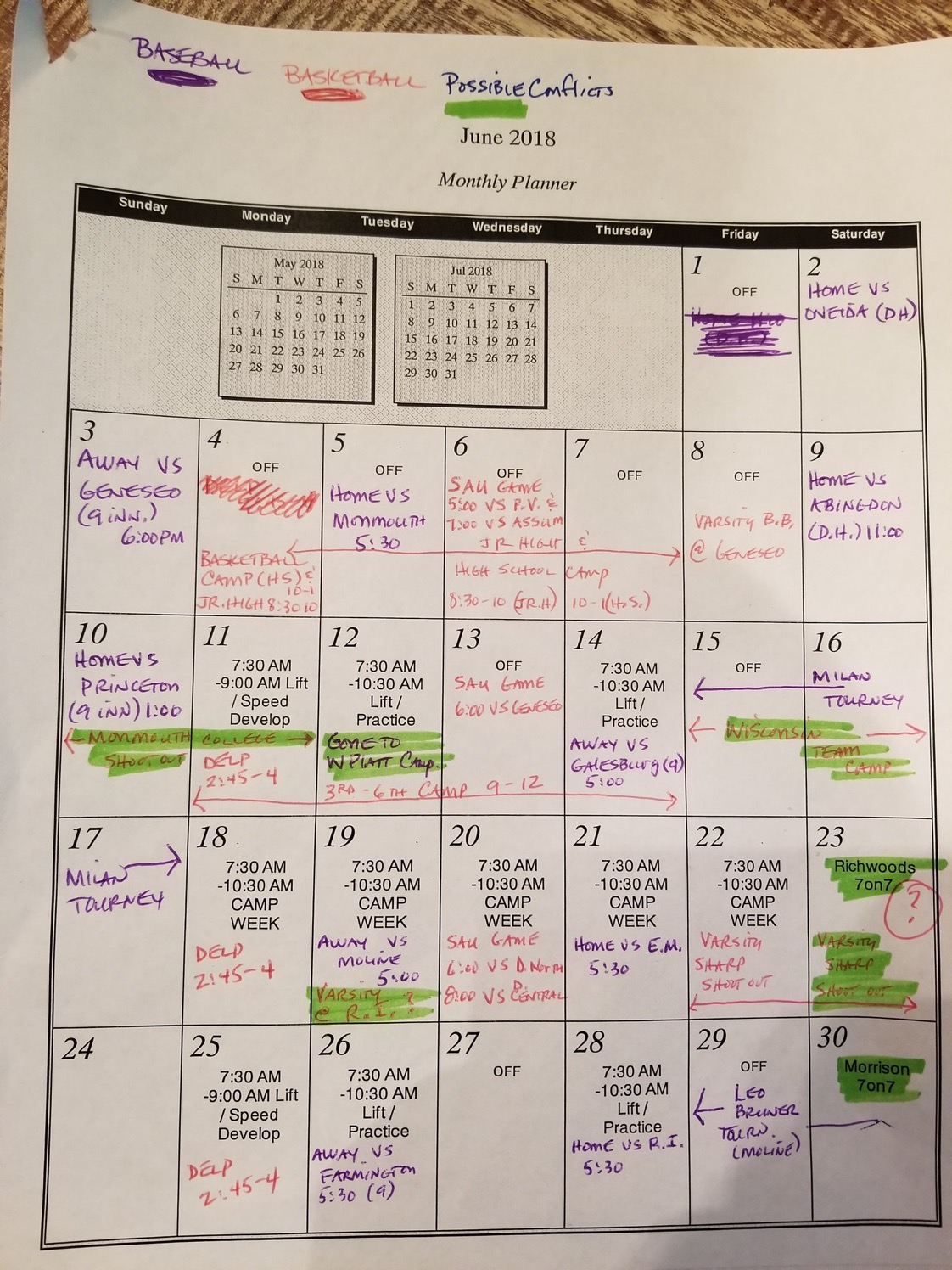 The calendar below was posted by a parent on May 31, 2018. Maybe coaches should take a deep breath and understand the effects of mandated summer programs. It’s no wonder athletes feel pushed into choosing just one sport.