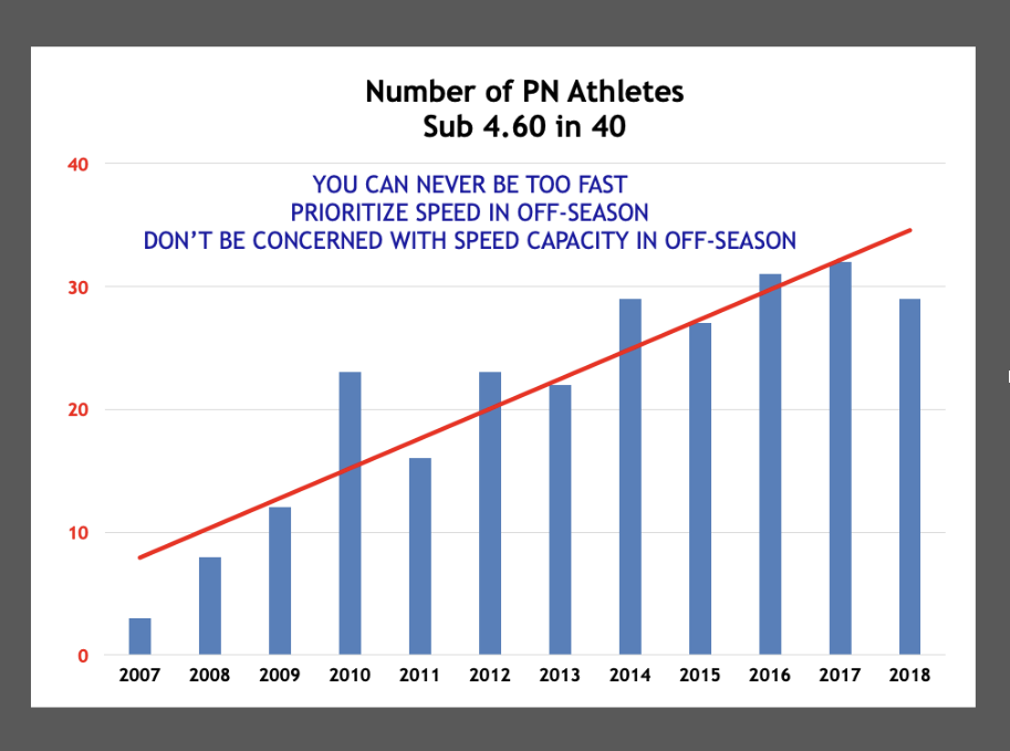In that first year (2007), we had only three guys sub 4.60 in the 40-yard dash. The year before playing for the IHSA State Championship, we had 31 sub-4.60 in the 40. The winter following our breakout football season, we had 32 sub-4.60. We may have lost to East St. Louis 26-13, but we were the faster team.